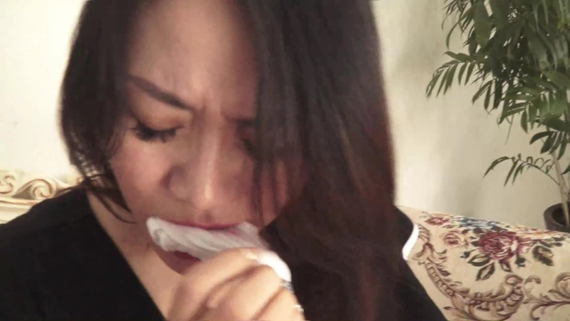 取下口球后,劫匪让李然张嘴,李然:张就张,那么凶干什么?劫匪一下子捏住李然的鼻子,说少废话,把肉色连裤丝袜一点点塞入李然的口中,塞得李然表情痛苦。随即劫匪用绿色电工胶布与紫色自粘绷带缠绕封在李然嘴外面。