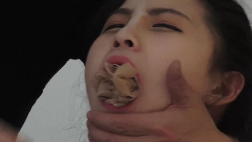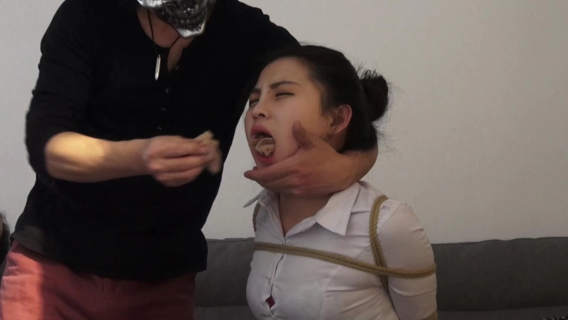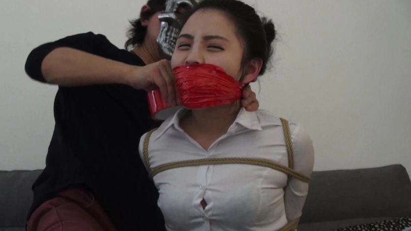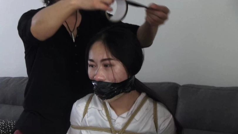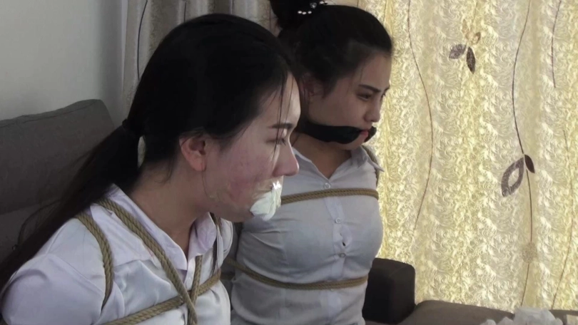 刘娜和孙甜姐妹二人被劫匪入室袭击,五花大绑坐在沙发上挣扎,劫匪又拿绳索将二人捆绑加固,分别拿一双棉袜和几双肉色短丝袜塞住刘娜和孙甜的嘴巴,塞得二人表情痛苦。