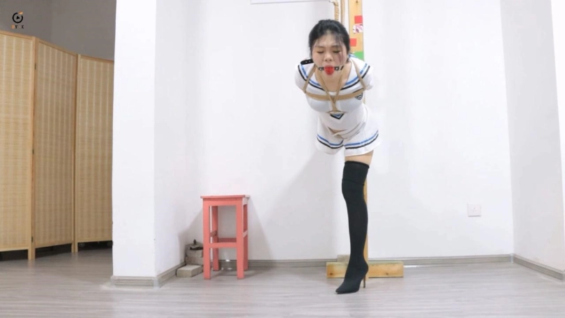 菲儿穿着一身紧身JK水手服来工作室应聘模特,换上了X感的丝袜靴(有换鞋的特写),被绳师单腿吊起来测试柔韧性和耐力,还给嘴巴小的菲儿戴上了一个超大的口球,菲儿被吊的很难受却发不出声音,口水都流成了一条线。