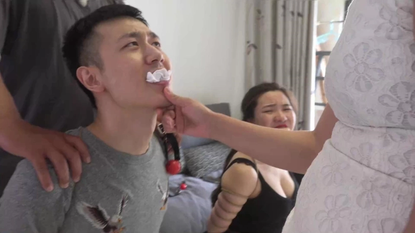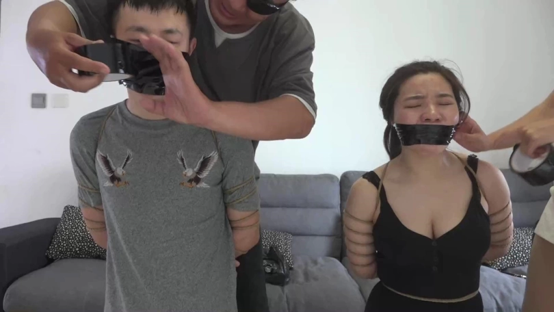 很快,李沐子和男友就被五花大绑,嘴里戴着塞口球跪在沙发前地上扭动身体挣扎着。